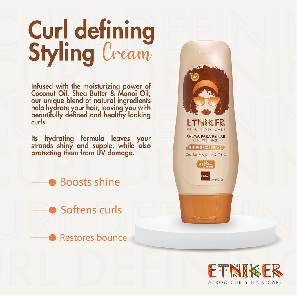 LA CREMA PARA PEINAR ETNIKER proporciona HIDRATACIÓN EXTRA con una EXCELENTE DEFINICIÓN y MOLDEO de los crespos característicos de la diversidad de cabellos Afro. Su uso, SIN ENJUAGUE, no sólo permite definir tu estilo sino que también brinda protección UV contra los rayos solares, que dañan y atacan las condiciones naturales del cabello.