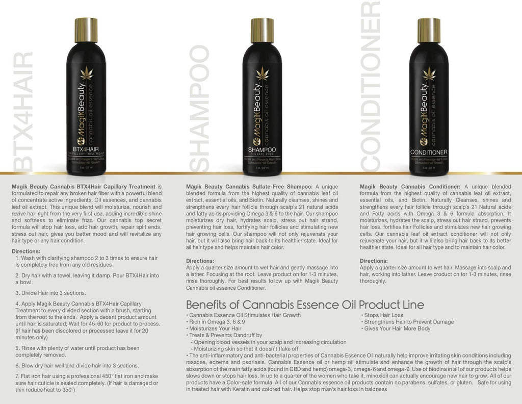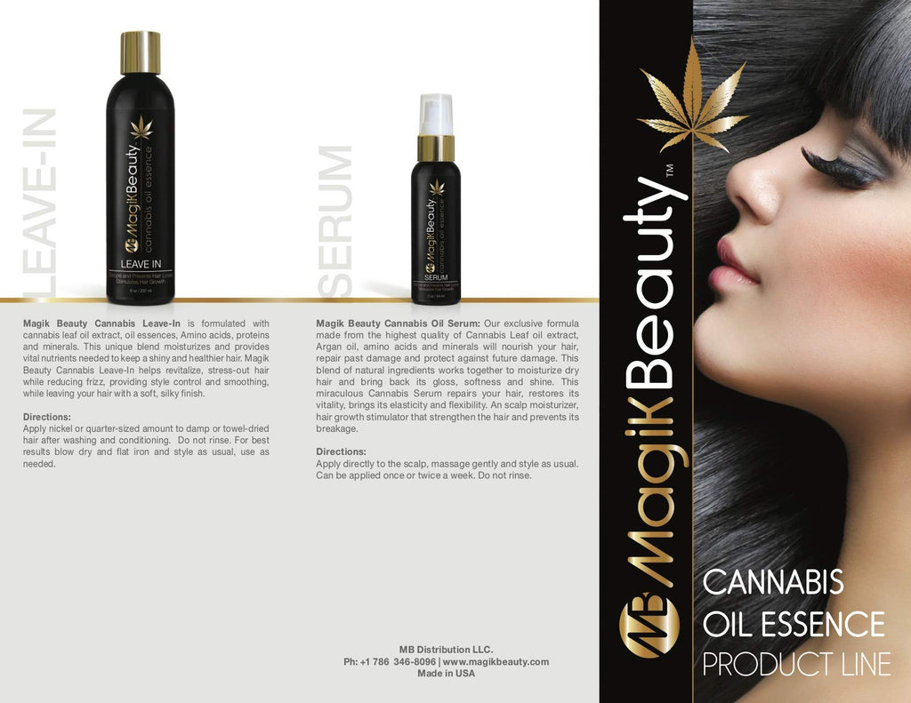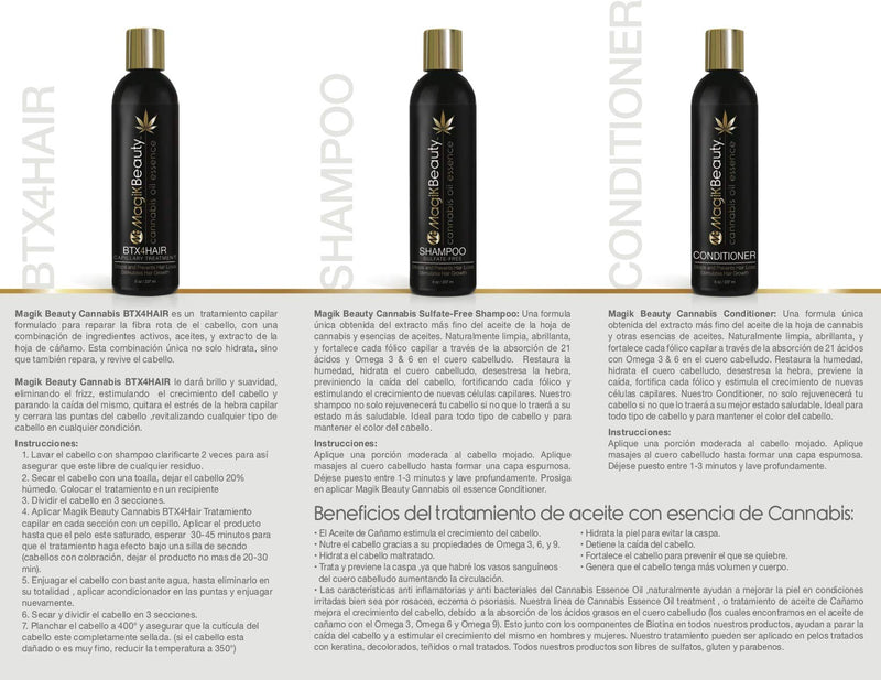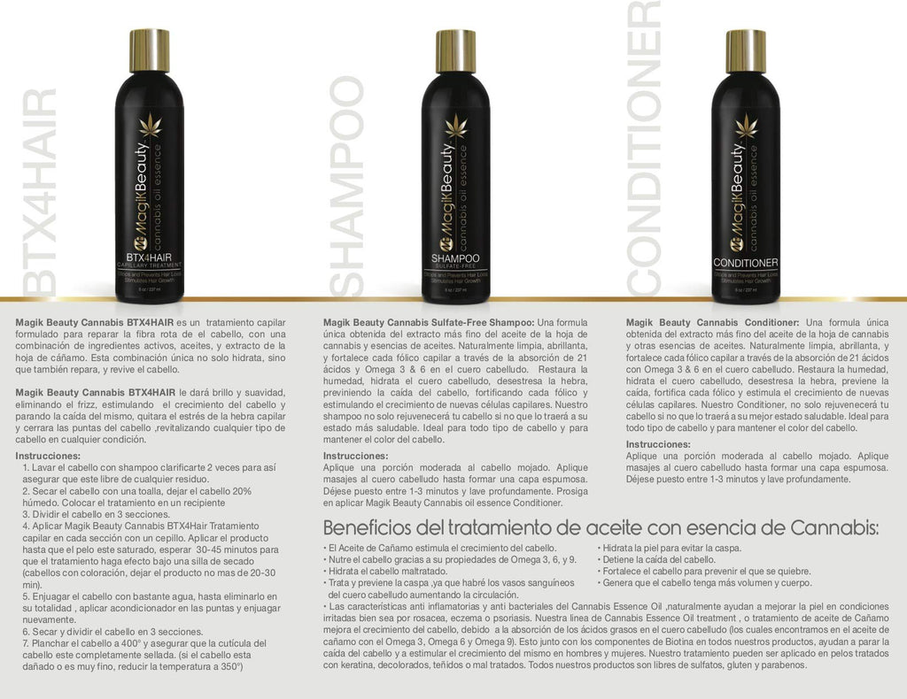 Magik Beauty Hemp Conditioner: A unique blended formula from the highest quality of Hemp leaf oil extract, essential oils, and Biotin. Naturally Cleanses, shines and strengthens every hair follicle through scalps 21 Natural acids and Fatty acids with Omega 3 & 6 formula absorption. It moisturizes, hydrates the scalp, stress out hair strand, prevents hair loss, fortifies hair Follicles and stimulates new hair growing cells. Our cannabis leaf oil extract conditioner will not only rejuvenate your hair, but it will also bring hair back to its better healthier state. Ideal for all hair type and to maintain hair color. Directions: Apply a quarter size amount to wet hair. Massage into scalp and hair, working into lather. Leave product on for 1-3 minutes, rinse thoroughly. Magik Beauty Hemp Conditioner: Una formula nica obtenida del extracto ms fino del aceite de la hoja de caamo y otras esencias de aceites. Naturalmente limpia, abrillanta, y fortalece cada flico capilar a travs de la absorcin de 21 cidos con Omega 3 & 6 en el cuero cabelludo. Restaura la humedad, hidrata el cuero cabelludo, desestresa la hebra, previene la cada, fortifica cada flico y estimula el crecimiento de nuevas clulas capilares. Nuestro Conditioner, no solo rejuvenecer tu cabello si no que lo traer a su mejor estado saludable. Ideal para todo tipo de cabello y para mantener el color del cabello. Direcciones: Aplique una porcin moderada al cabello mojado. Aplique masajes al cuero cabelludo hasta formar una capa espumosa. Djese puesto entre 1-3 minutos y lave profundamente.