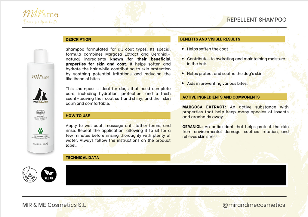 Protect your dog’s skin and coat with the MIR&ME Paw Cleaner Byebites Shampoo, a gentle yet effective repellent shampoo suitable for all dog breeds. Formulated with Lanolin, Neem Extract, and Geraniol, it helps soften, hydrate, and maintain moisture in the coat while providing a soothing effect on the skin.