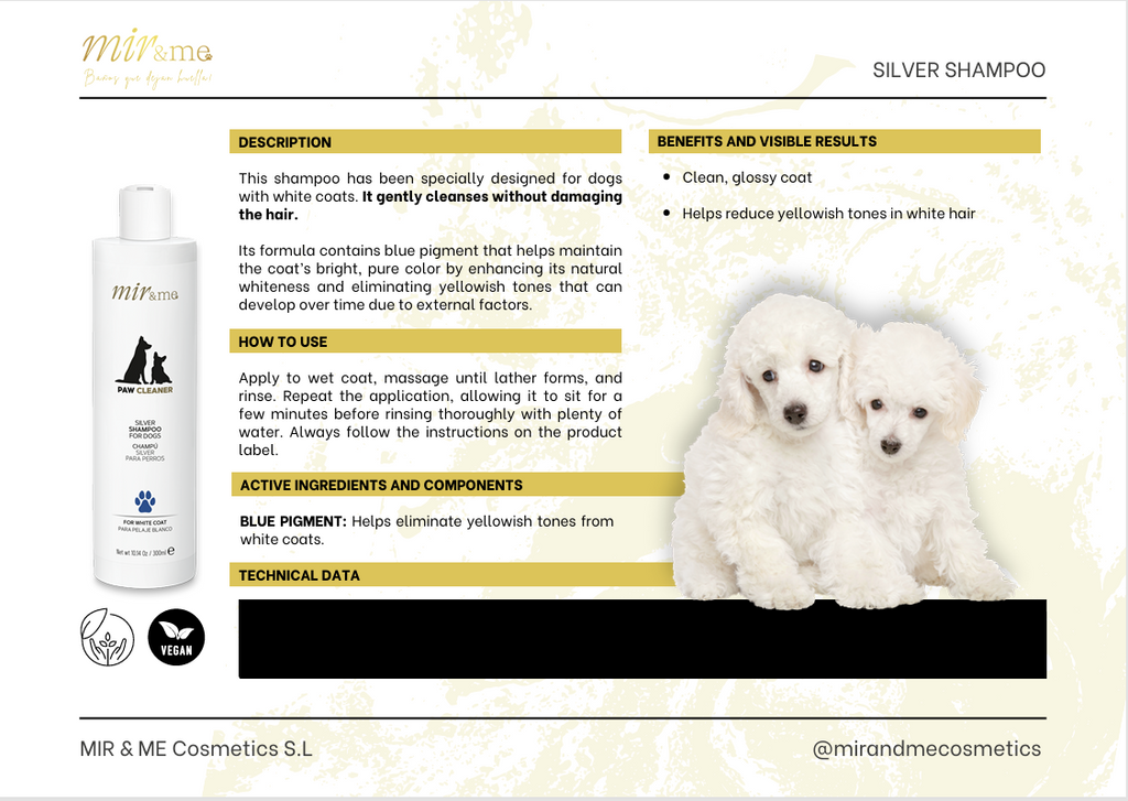 Keep your dog’s white coat bright, clean, and beautifully toned with the MIR&ME Paw Cleaner Silver Shampoo. Specially formulated for dogs with white or light-colored fur, this shampoo contains blue pigment that helps neutralize and reduce unwanted yellow tones, restoring a clearer and more luminous appearance.