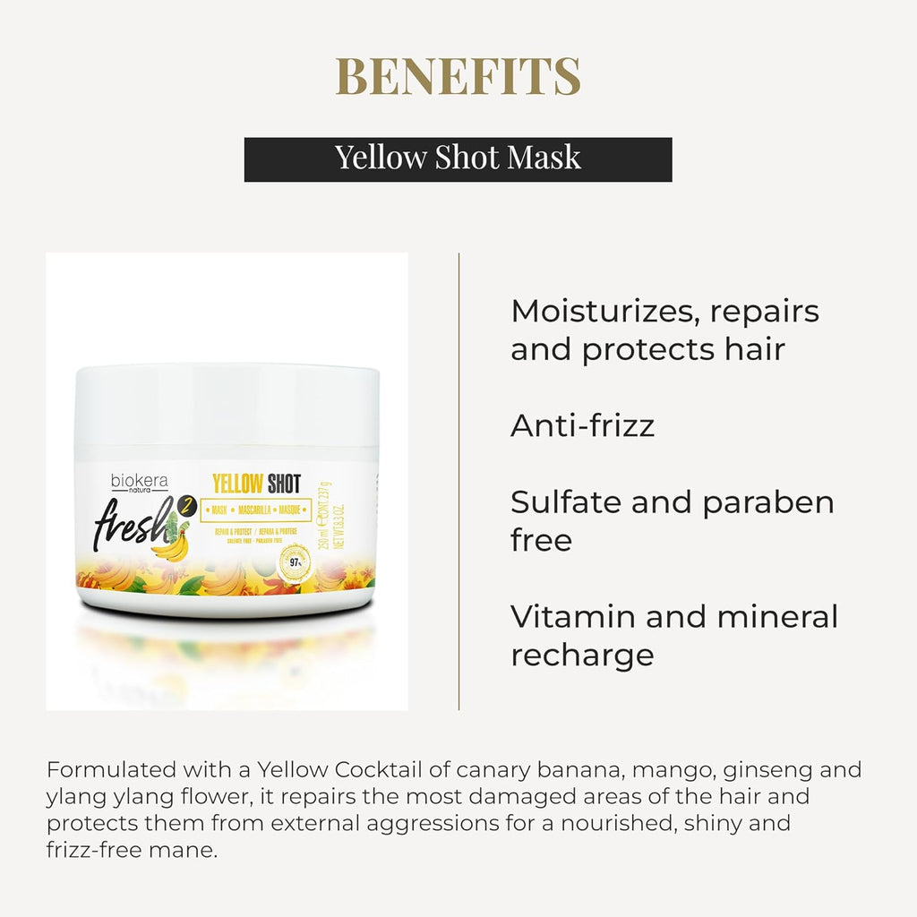 - REPAIRING HAIR MASK: Biokera Fresh Yellow Shot Mask offers an intensive repair therapy for damaged and over-processed hair. It gives hair greater hydration, shine, and frizz control for a healthy mane.