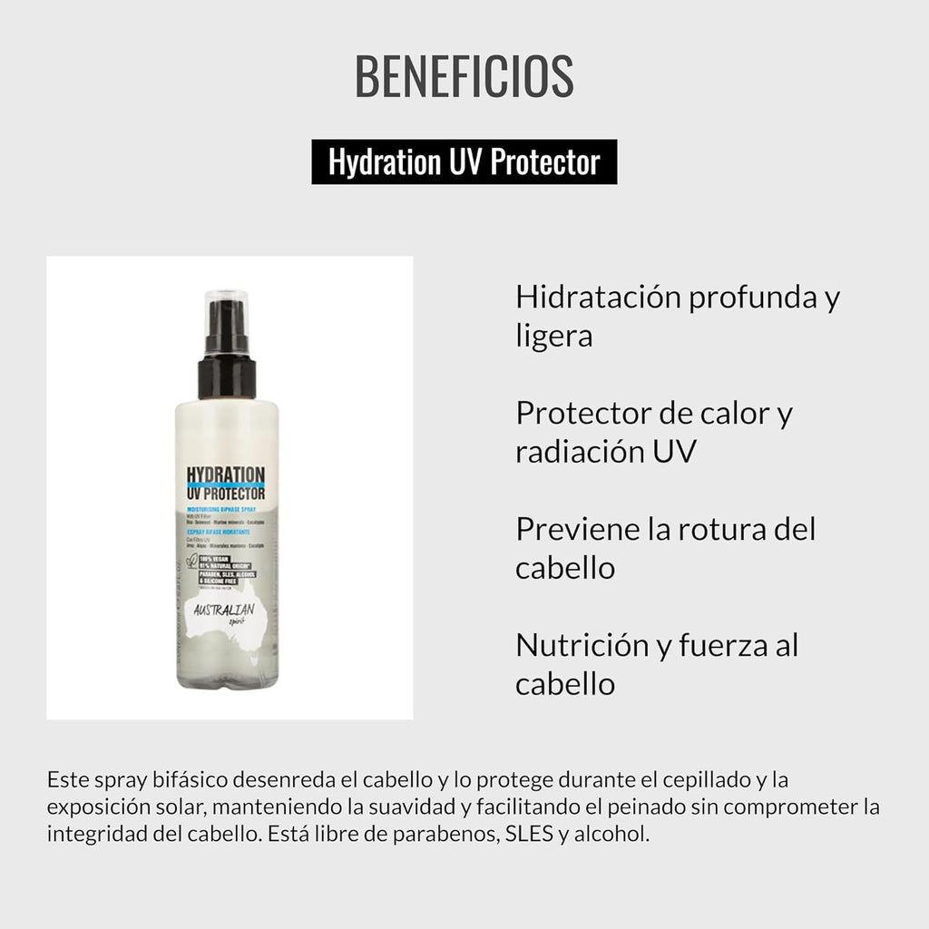 • DETANGLING HAIR SPRAY: Hydration UV Protector is a bi-phase spray formulated with algae and marine concentrates that prevent color loss, breakage, and protect against UV radiation, providing nutrition, strength, and resilience to the hair.