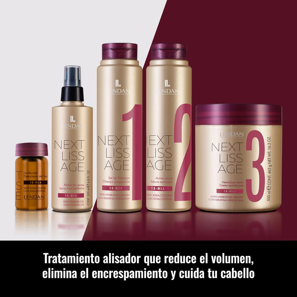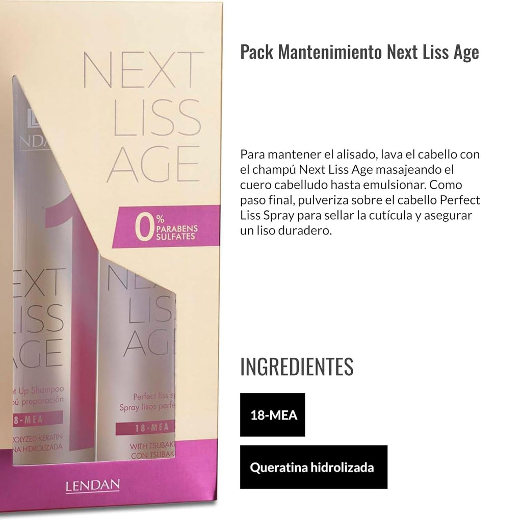 - STRAIGHTENING MAINTENANCE PACK: The Next Liss Age Straightening Maintenance Pack by Lendan helps maintain smooth hair for longer after straightening treatments. The set includes the Preparation Shampoo step 1 and the Perfect Smooth Spray.