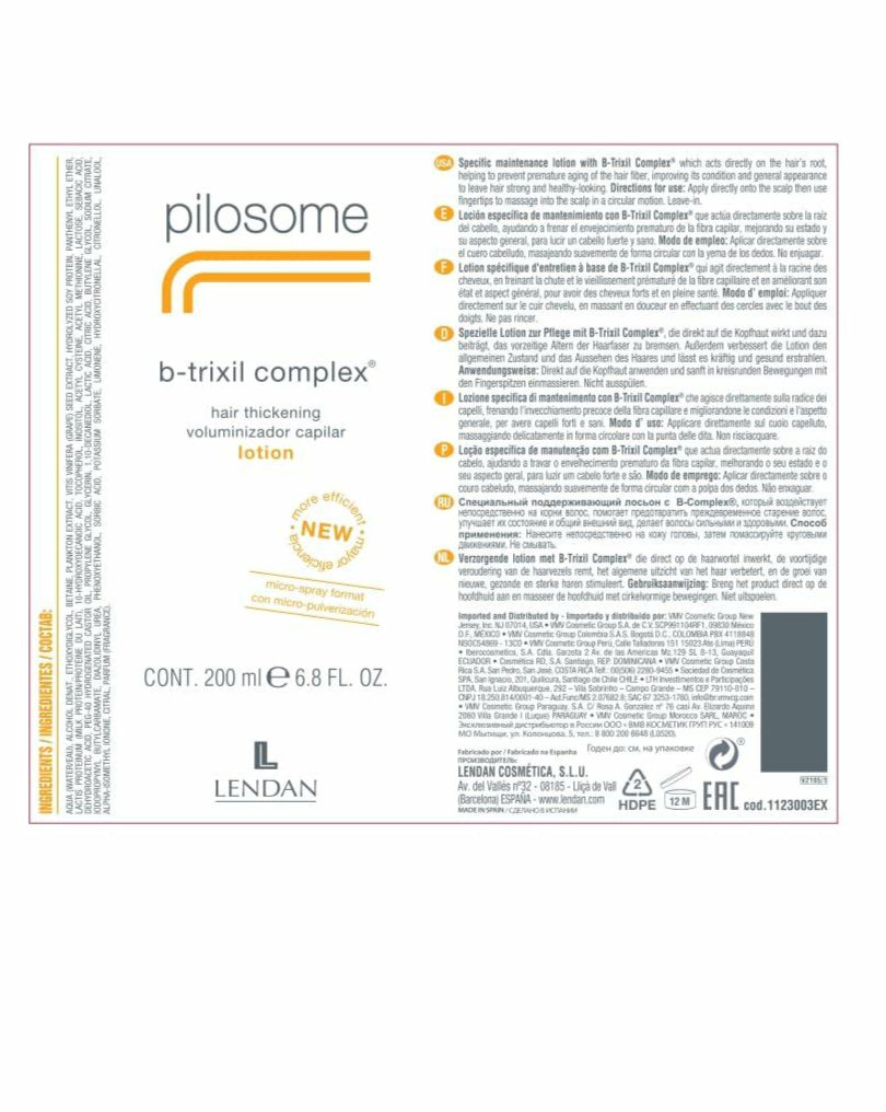 The Pilosome Stimul hair lotion from Lendan is a fortifying treatment designed for both women and men. Its advanced formula features an exclusive complex that combines various active ingredients to address hair restructuring and revitalization from within the hair bulb. This treatment is characterized by its ability to strengthen the hair fiber and revitalize the hair. By acting directly on the hair bulb, Pilosome Stimul lotion significantly contributes to nourishing and hydrating the hair while promoting a healthier, more resilient scalp. The B-Trixil Complex technology in this lotion acts as a true cellular alarm clock within the hair bulb, helping to prevent premature aging. This restructuring action supports follicular nourishment, revitalizing the internal and external structure of the hair. To get the full benefits of this fortifying hair lotion, it is recommended to apply a few sprays directly onto the scalp and gently massage with your fingertips in circular motions. No rinsing is necessary, making it easy to incorporate into your daily hair care routine. At Lendan Cosmetics, we have over 50 years of experience in the hairdressing and beauty products sector. We prioritize research and the development of innovative formulas to offer the best results in hairdressing products.