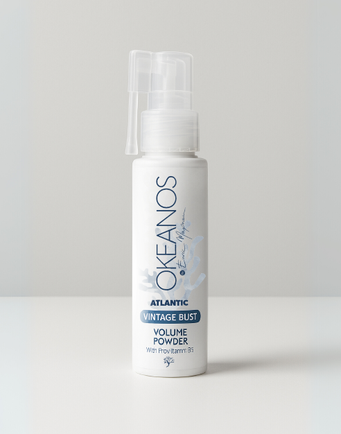 VOLUME POWDER VINTAGE BUST ATLANTIC by OKEANOS is an extra‑matte texturizing powder with medium hold. Ideal for adding volume to fine hair, giving body at the roots, or creating structured, tousled looks with a natural undone effect.
