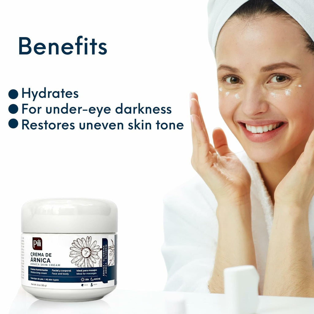 Elevate your skincare with Pili Arnica Cream, a 3-pack of 1oz each. This rich, nurturing moisturizer soothes and hydrates, leaving your skin smooth. This Arnica cream offers maximum benefits, providing relief to body discomforts and promoting a soothing experience. Crafted with Natural Arnica, it calms, softens, and naturally reinforces beauty. Perfect for severe dryness or delicate skin. Unscented, non-greasy, and cruelty-free, it's a versatile face cream and ideal for hands and feet. Developed by experienced professionals, our formula penetrates skin, repairs, and rejuvenates. Enjoy the benefits of a double-action, fast-absorbing, and fragrance-free formula. Say goodbye to dryness and hello to touchable softness! This product is manufactured by passionate individuals with 60+ years of experience in the retail pharmacy and cosmetics manufacturing industries. Were committed to only proving you with the best products that nature has to offer. Enjoy this new 3 pack of 1 ounce each. Directions: Massage into dry skin up to 5 times a day. Manufactured by: F.D. San Jorge Ltda. Made in Colombia . Distributed in USA by Naturistika LLC. https://pilinatural.com/ Ingredients: Aqua (water), Paraffinum Liquidum, Stearic Acid, Glycerin, Arnica Montana (arnica) Flower Extract, Octyldodecanol, Beeswax, Ceteareth-20, Cetyl Alcohol, Triethanolamine, Sodium Propylparaben, Sodium Methylparaben, Disodium Edta.