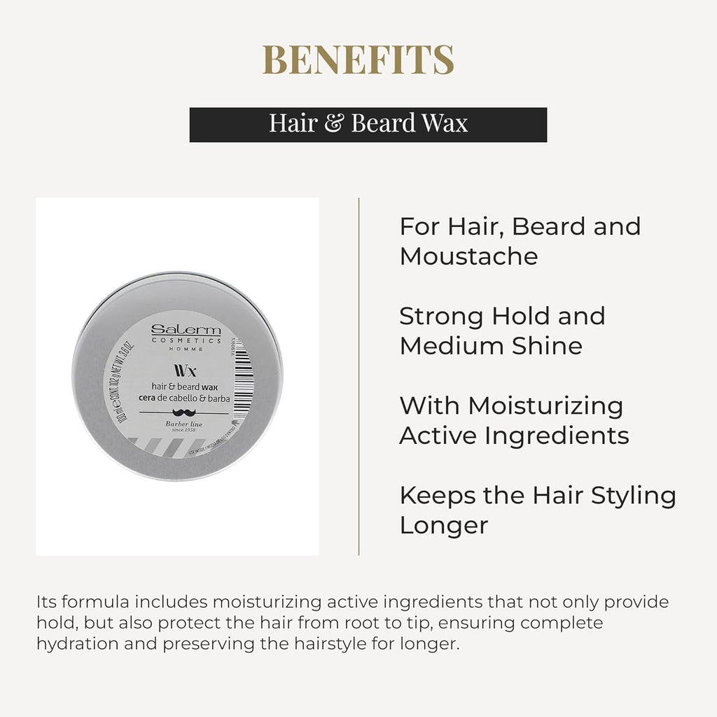 This water-soluble hair wax for men offers strong hold for both hair and beard and mustache, maintaining the hairstyle with the desired shape and style for prolonged periods. This guarantees a lasting and flexible look for hairstyles. In addition to providing hold, this formula contains moisturizing actives that protect the hair from root to tip, ensuring complete hydration and maintaining the hairstyle for longer. This combination of hold and comprehensive protection is ideal for maintaining an impeccable and well-groomed style. Versatility is a standout feature of this wax, as it offers total control over styling. From structured hairstyles to more casual looks, this wax allows for experimenting with different styles while maintaining the flexibility to adjust the hairstyle as desired. For optimal application, it is recommended to apply a small amount to the hands and distribute over the hair, beard, and/or mustache. When applied to dry hair, it provides firmer hold and, if necessary, can be reactivated with water to adjust the desired style. At Salerm Cosmetics, we focus on creating innovative and high-quality professional hairdressing products to offer our clients the best in hair treatment. We are a recognized brand in the world of beauty and hair care with a long history.